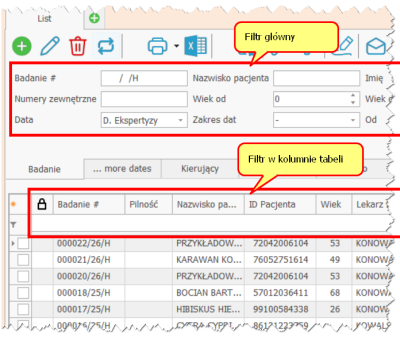 Jeśli masz wyświetlone np. 200 badań i wpiszesz „Nowak” w kolumnie – system przeszuka tylko te 200 pozycji.