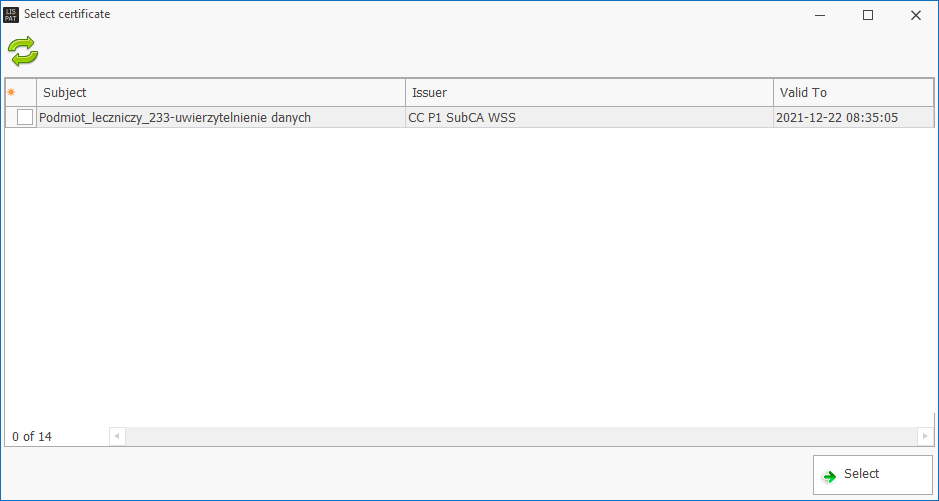 System LISPAT wspiera mechanizm podpisywania wyników badań przy pomocy dowolnego certyfikatu zainstalowanego w magazynie certyfikatów osobistych Windows.