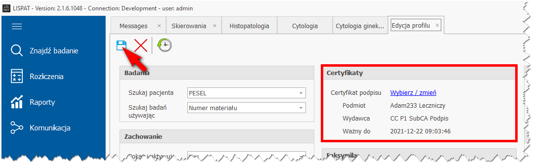 Skuteczny wybór certyfikatu będzie widoczny w oknie edycji profilu, jak na rysunku poniżej i kliknąć ikonę zapisu
