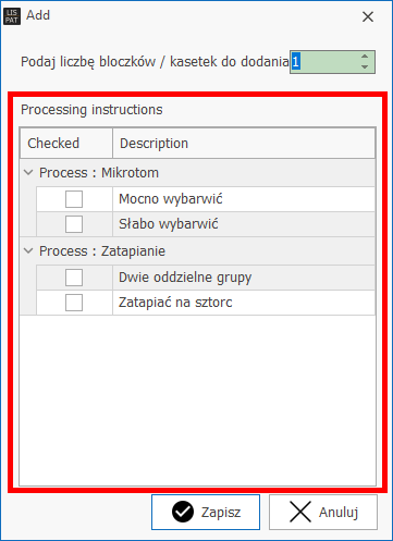 - Każda instrukcja jest tworzona z przypisaniem do procesu, w którym ma się pojawić. Np. patomorfolog może wybrać dwie instrukcje: 1. Zatopić w pionie, 2. Mocno wybarwić. Pierwsza instrukcja powinna pojawić się na zatapianiu a druga na stanowisku: barwienia lub skrawania (tak, żeby osoba skrawająca mogła odłożyć szkiełko na bok)