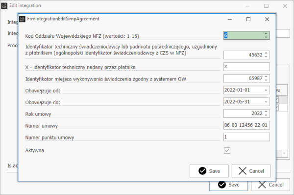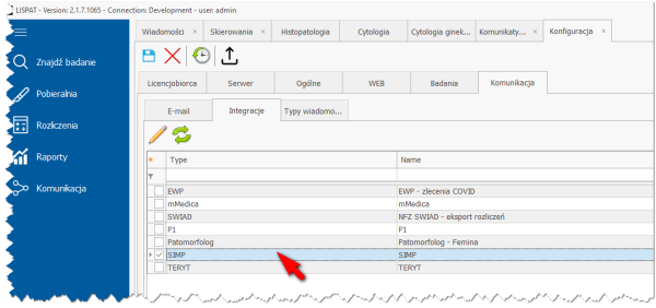 Konfiguracja konfiguracji z SIMP polega na zdefiniowaniu umów w ramach których wykonywane są badania. Konfigurację ustala się w menu Administracja > Konfiguracja > Komunikacja > Integracje > SIMP