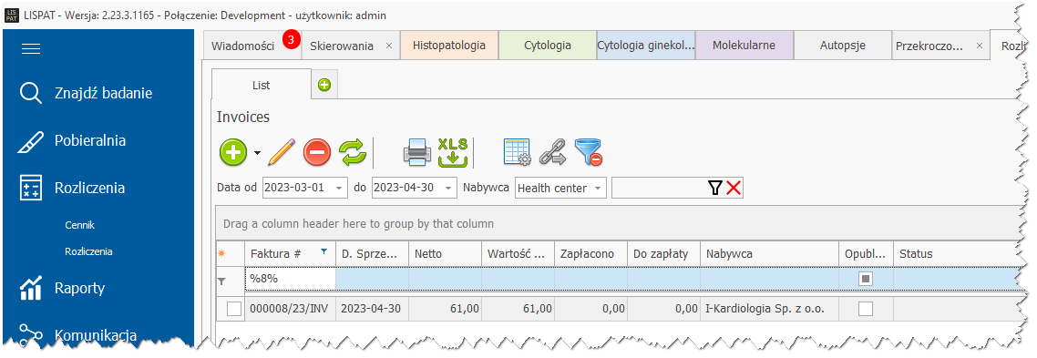 Użytkownik wystawił fakturę za wykonane badania opiewającą na kwotę 61 PLN.