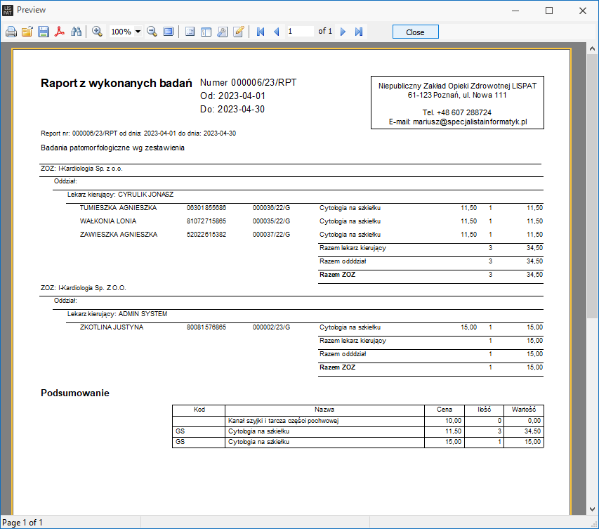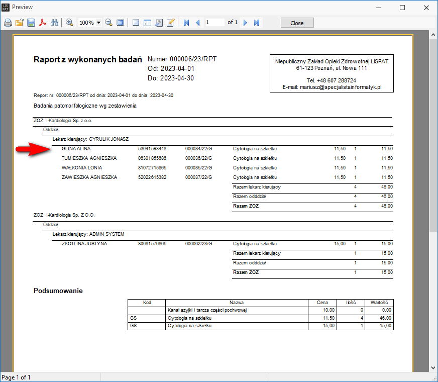 Na wydruku „Raportu z wykonanych badań” do faktury korygującej, użytkownik zobaczy wszystkie pozostałe badania (te, których nie usunięto).