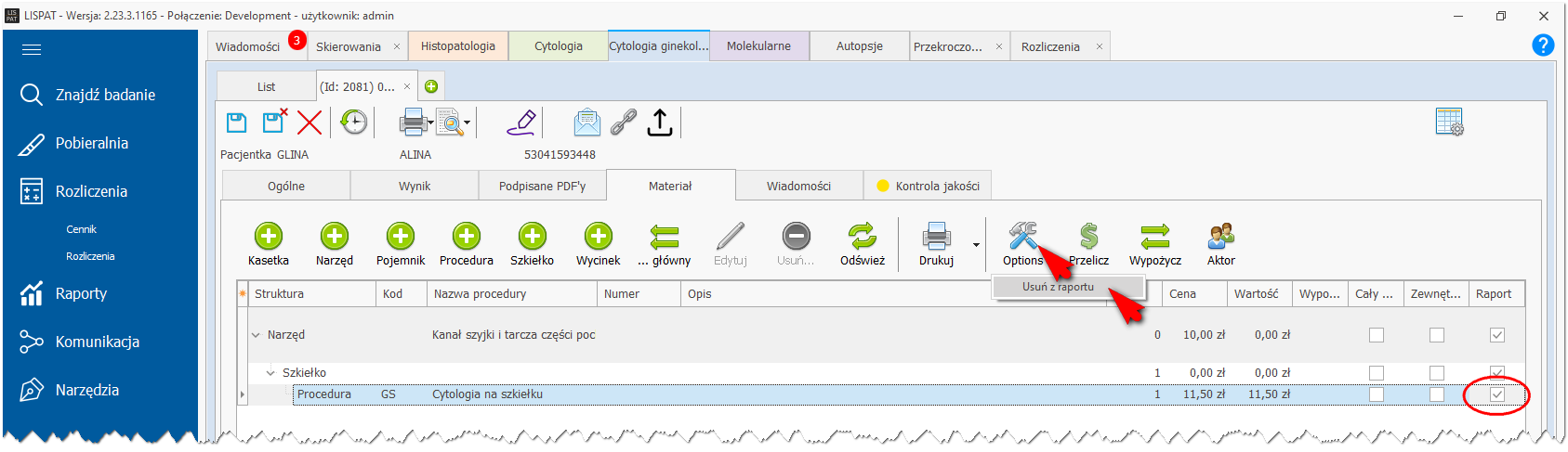 Problematycznym badaniem jest badanie 34/22/G, wiec użytkownik przechodzi do właściwego badania, w zakładce „Materiały” zaznacza właściwą pozycję i wybiera opcje „Usuń z raportu”.