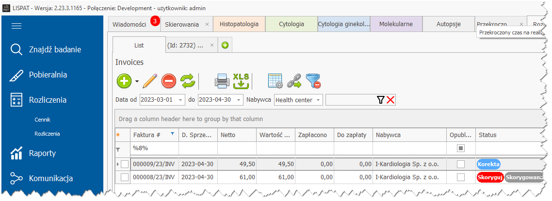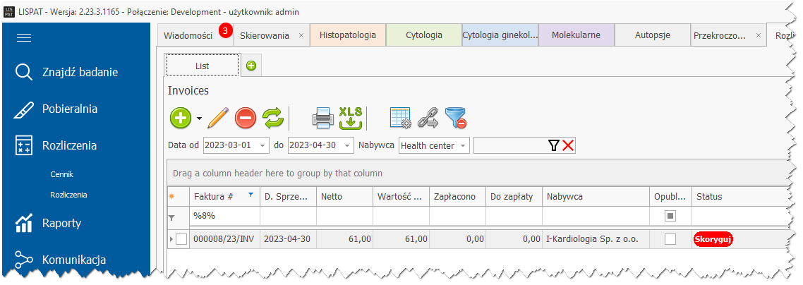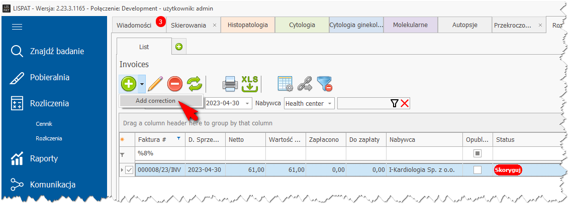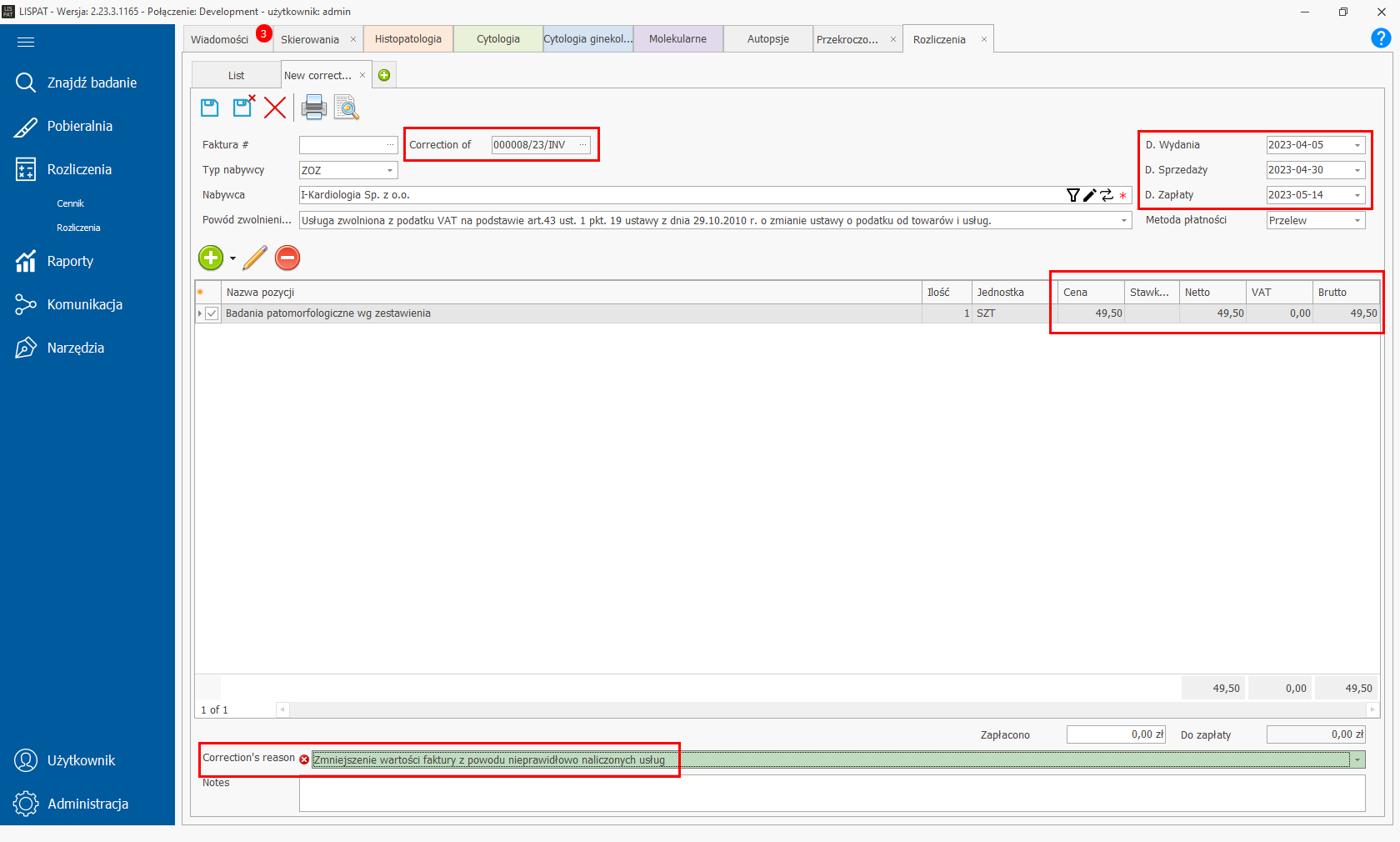 System LISPAT wspiera korygowanie faktur 'in-minus' w sytuacjach, gdy oryginalna faktura (przypadkowo) zawierała nadmiarowe badania, które muszą zostać usunięte z faktury. W przypadku zmian 'in-plus' należy wystawić dodatkową fakturę.