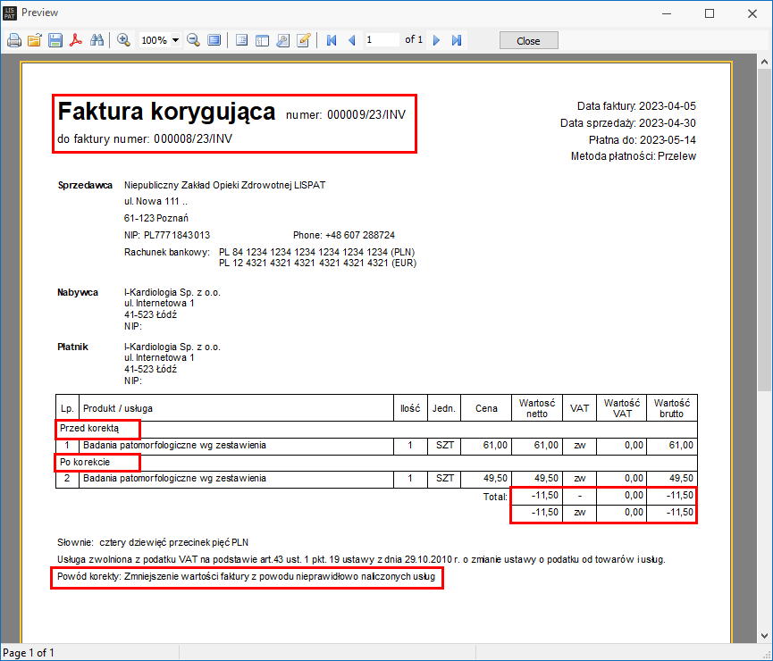- Ceny i wartości usług zmniejszone stosownie do wartości badań usuniętych z faktury