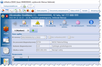 Wystawienie skierowania odbywa się w mMedica w module Gabinet > edycja wizyty > Skierowania > Badania diagnostyczne, zgodnie z instrukcją obsługi mMedica.