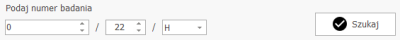 Wyszukiwanie wg numeru badania realizuje się w górnej części okna, wpisując pierwszą część numeru w pierwszym polu. Użytkownik może wskazać też rok z którego pochodzi badania oraz jego typ główny. Celem uruchomienia wyszukiwania należy wcisnąć przycisz 'Szukaj'