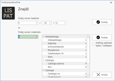 Wyszukiwanie wg numeru materiału realizuje się w dolnej części okna wyszukiwania. Użytkownik może podać numer szukanego materiału oraz (jeżeli jest taka potrzeba) ograniczyć zakres wyszukiwania do określonego typu materiału. Uwaga! To użytkownik odpowiada za sprawdzenie, czy odszukane badanie jest typ, którego numer wprowadził w polu wyszukiwania. Jeżeli wyszukiwany numer badania nie jest unikalny w bazie danych, LISPAT może nie znaleźć tego badania, które użytkownik miał na myśli.