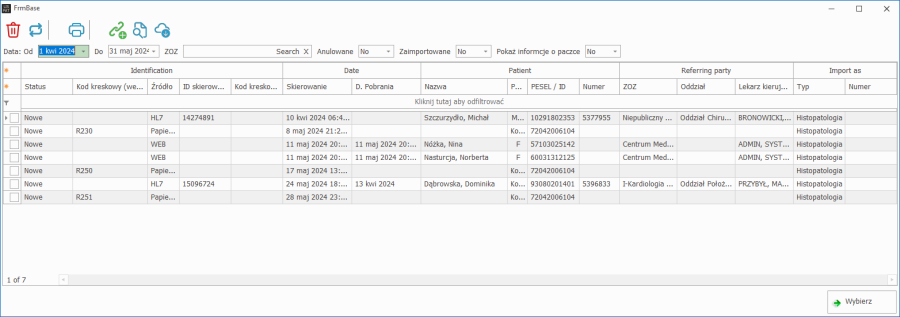 Wybranie skierowania, spowoduje, że dane kliniczne, dane pacjenta, lekarza kierującego czy ZOZu zostaną skopiowane ze skierowania do rekordu badania.