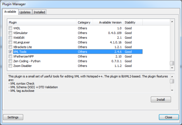 Uruchomić program i przejść do Plugins > Plugin manager > Show Plugin Manager znaleźć Xml Tools. Znaznaczyć pole przy tym rozszerzeniu i kliknąć instaluj