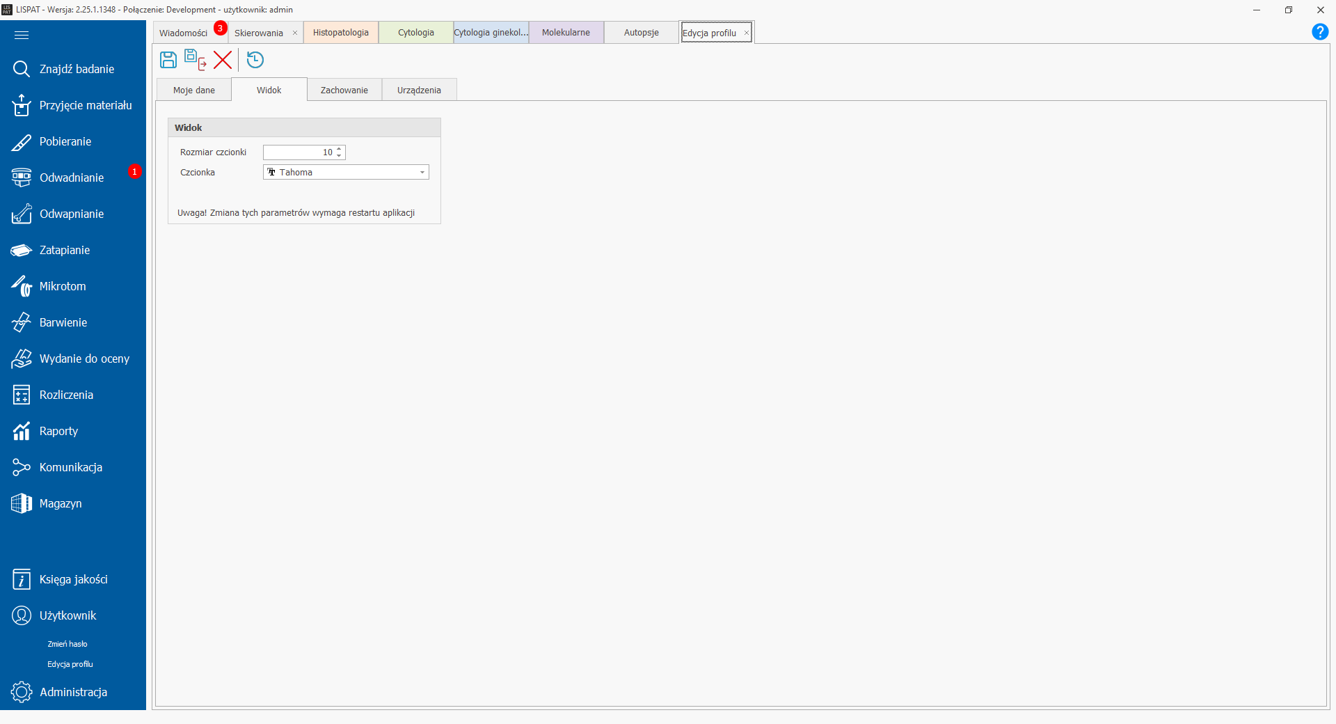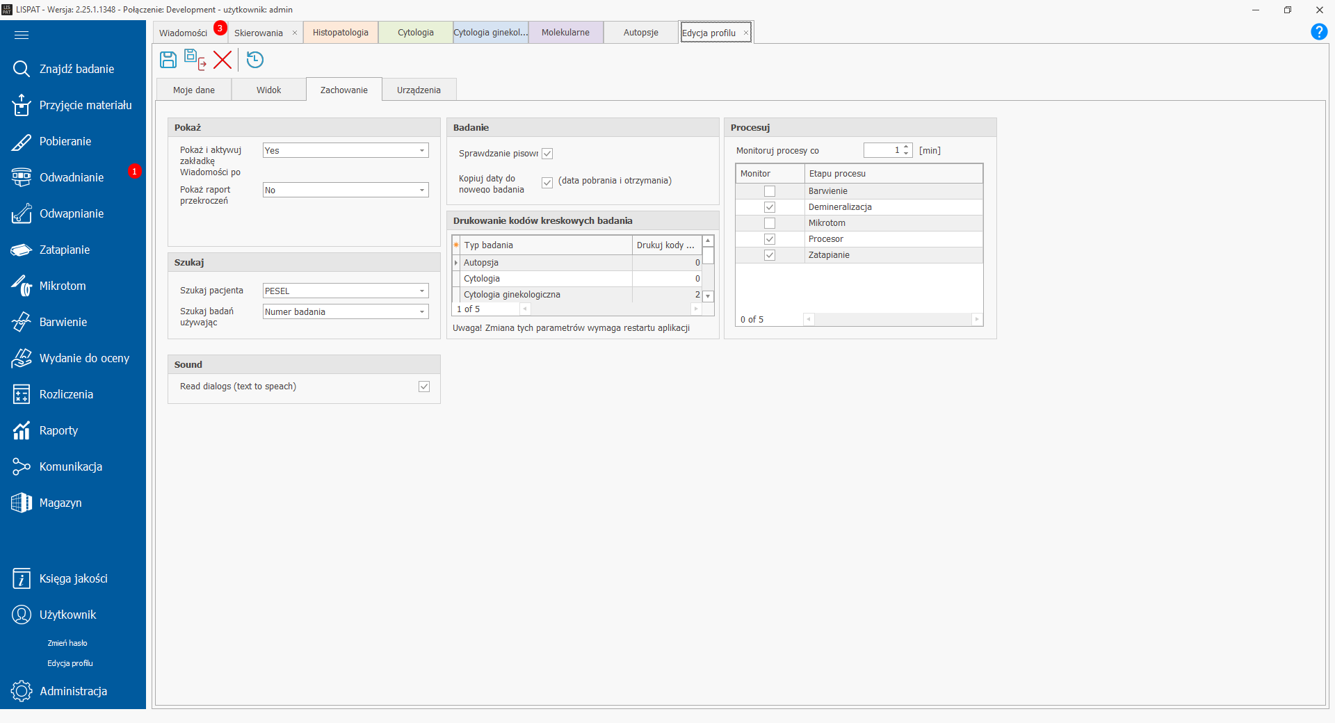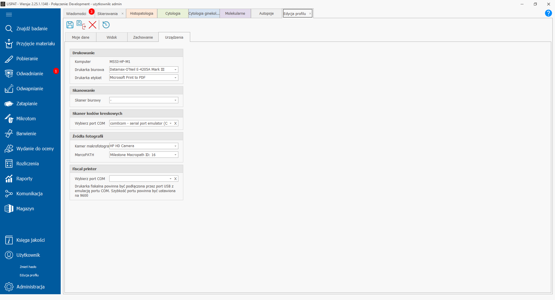 - System LISPAT daje możliwość skonfigurowania różnych drukarek dla różnych typów wydruków (np. inna drukarka dla etykiet na szkiełka i inna drukarka do kasetek). Zaawansowaną konfigurację drukarek ustawia się w Administracja > Drukarki.