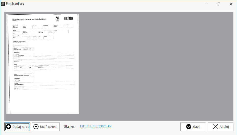 Kliknięcie przycisku 'Zapisz' (Save) powoduje wysłanie zeskanowanych dokumentów na serwer.