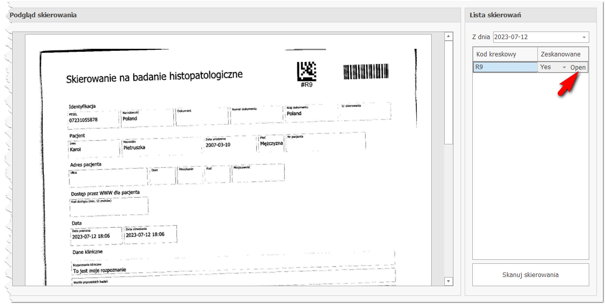 Kliknięcie przycisku 'Otwórz' włącza podgląd zeskanowanego skierowania.