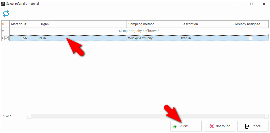 W codziennej praktyce stanowiska przyjęć, wielokrotnie pojawi się sytuacja, gdzie ilość dostarczonych pojemników będzie większa niż ilość pojemników zadeklarowanych w skierowaniu. W takiej sytuacji, gdy LISPAT pokaże użytkownikowi listę skierowanych materiałów a przyjmowanego materiału nie ma na liście, użytkownik powinien kliknąć przycisk „Nie znalazłem”.