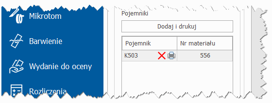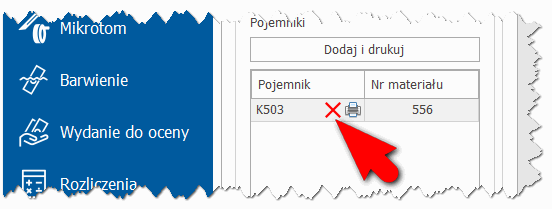 W przypadku błędnego dodania pojemnika do listy, użytkownik ma możliwość usunięcia pojemnika z listy klikając ikonę przy błędnie dodanym pojemniku.