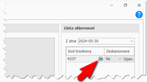 Użytkownik ma możliwość ponowienia wydruku kodu kreskowego na skierowanie przez kliknięcie ikony jak na rysunku poniżej.
