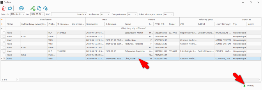 W oknie wyszukiwania należy użyć dostępnych mechanizmów aby znaleźć badania, wskazać je a następnie kliknąć przycisk Wybierz.