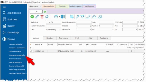 Fakt wypożyczenia / zwrotu materiału ma swoje odzwierciedlenie w oknie badania (zakładka materiały).